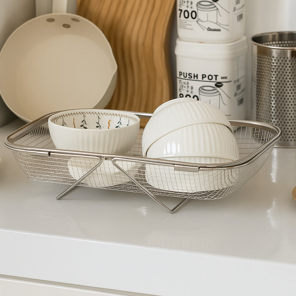 Enquanto escorredores comuns deformam e enferrujam, o FlexDry™ é feito em aço inox de alta resistência, suportando até 2kg com estabilidade. É a escolha inteligente para quem quer praticidade sem abrir mão da qualidade e da estética.