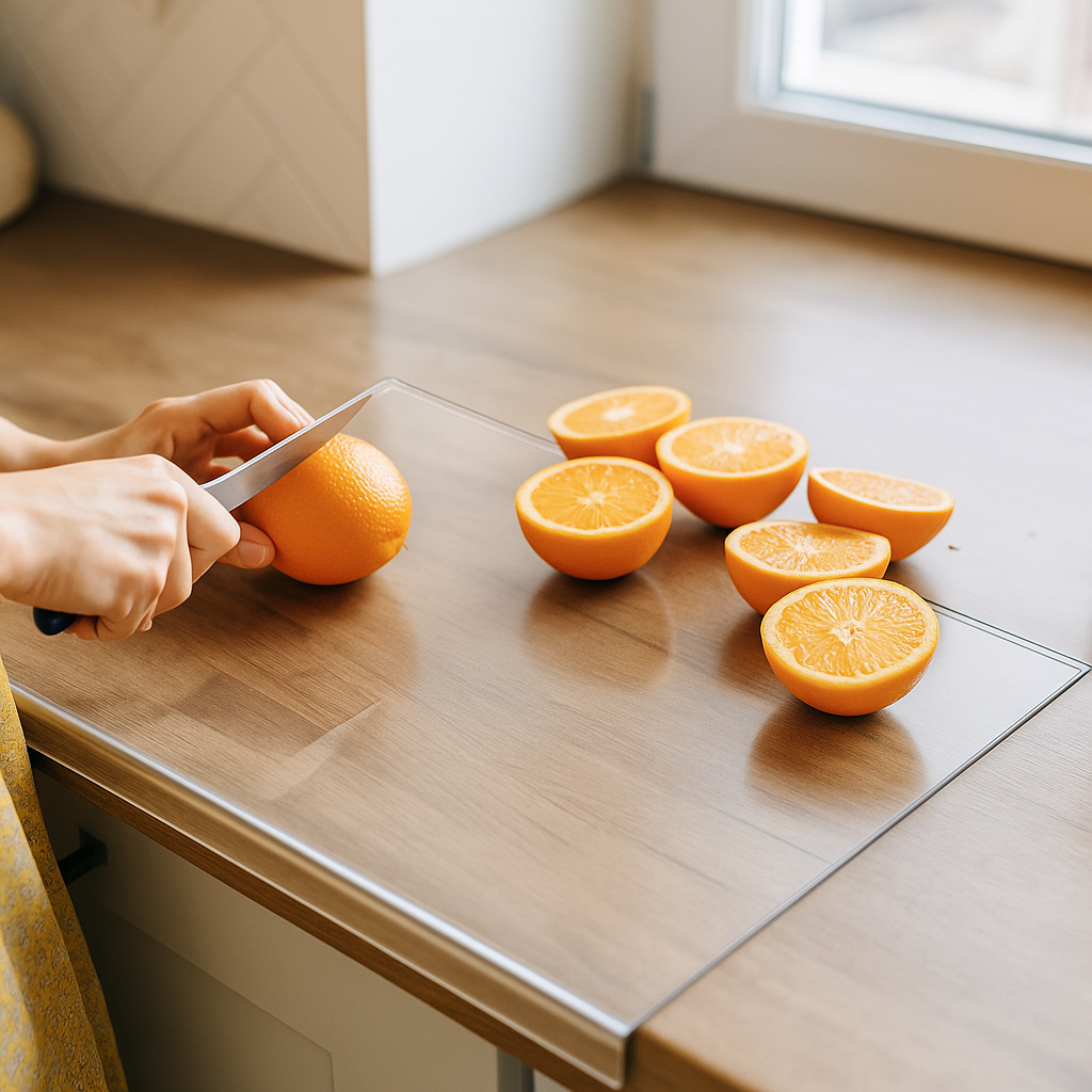 As tábuas tradicionais de madeira e plástico são porosas e acumulam água, manchas e odores. A SmartClean™ é feita de acrílico não poroso, o que impede a proliferação de germes e facilita a limpeza, tornando sua rotina na cozinha muito mais prática e higiênica.